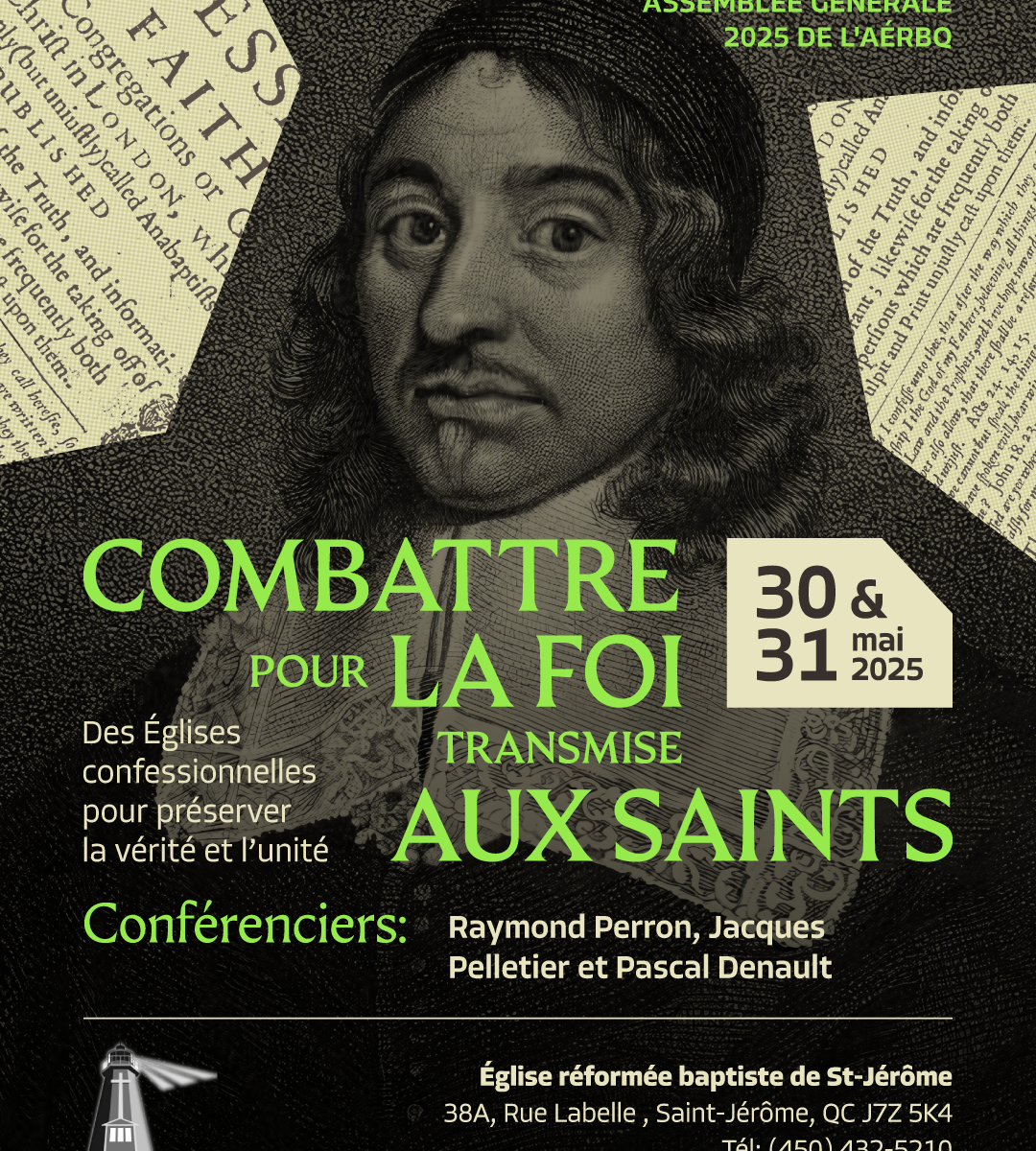 L’assemblée générales des Églises réformées baptistes du Québec aura lieu à St-Jérôme les 30-31 mai prochains. Visitez ce lien si vous voulez vous inscrire gratuitement à la conférence Des Églises confessionnelles pour préserver l’unité et la vérité.