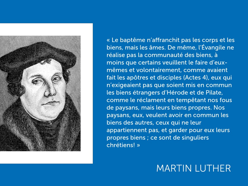 « Le baptême n’affranchit pas les corps et les biens, mais les âmes. De même, l’Évangile ne réalise pas la communauté des biens, à moins que certains veuillent le faire d’eux-mêmes et volontairement, comme avaient fait les apôtres et disciples (Actes 4), eux qui n’exigeaient pas que soient mis en commun les biens étrangers d’Hérode et de Pilate, comme le réclament en tempêtant nos fous de paysans, mais leurs biens propres. Nos paysans, eux, veulent avoir en commun les biens des autres, ceux qui ne leur appartiennent pas, et garder pour eux leurs propres biens ; ce sont de singuliers chrétiens! »